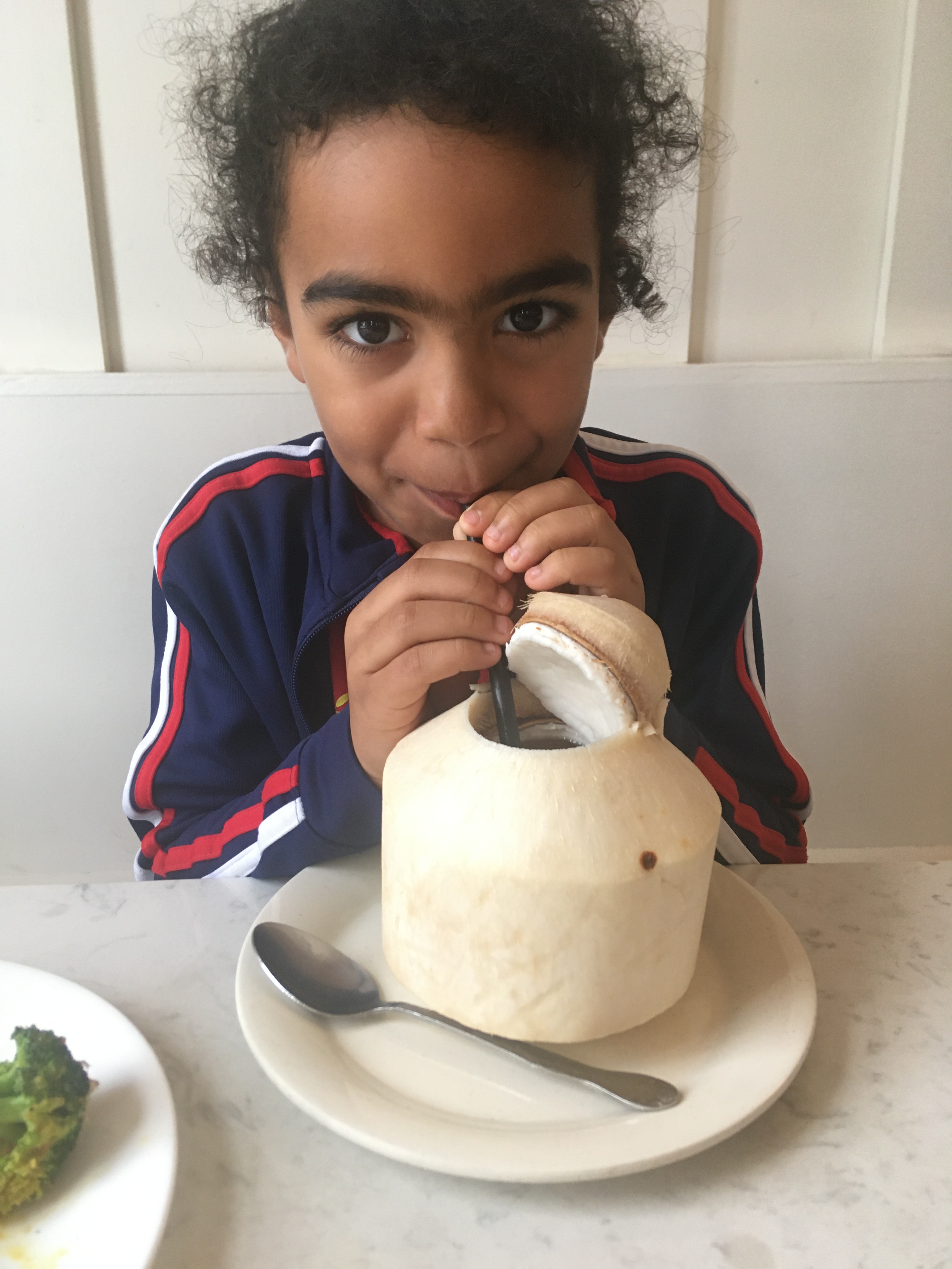 My papa and I both chose the buffet. I tried some of my papa’s Tom Yum Soup. It was kind-of sweet, a little sour, and a little spicy. It had some really yummy mushrooms in it. It was really warm when we got it and it looked like it had some spices on the top. I also had some fried kale, it was super crispy and crunchy and salty and kind-of sweet. It had sesame seeds on it. I really liked that. We also had Pad Thai, which was a little sour and kind-of sticky in a good way. I also tried and liked: Fried Rice with carrots and peas, Brown Rice, Veggie Satay, Fried in Chili Sauce, and Fried Spring Rolls and sauce.